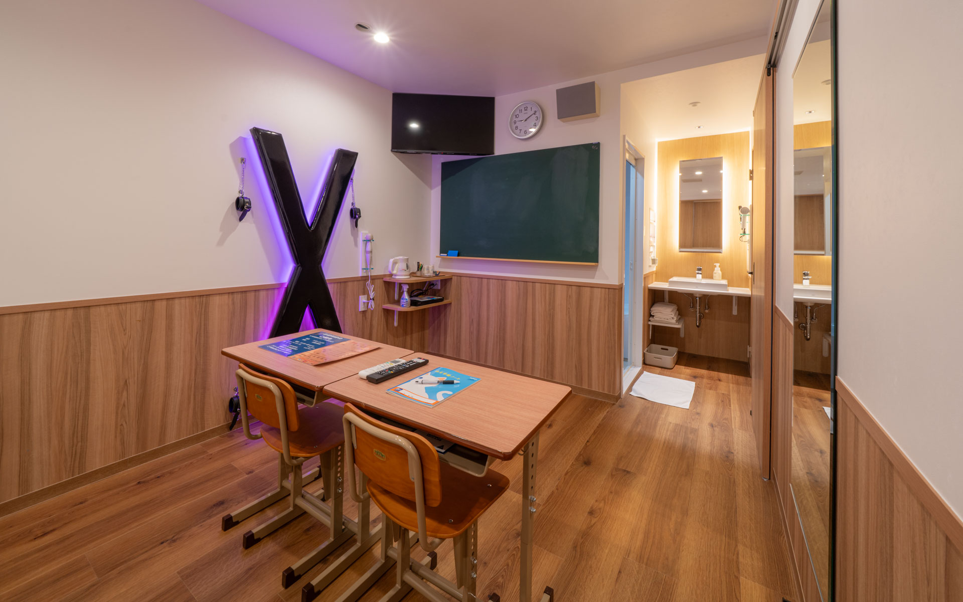 さらに、天井には学校でよく見かける放送スピーカーや、教室風の壁掛け時計も配置しています。 その結果、学生時代の思い出に浸りながら、いつもとは違うシチュエーションでの滞在をお楽しみいただけます。